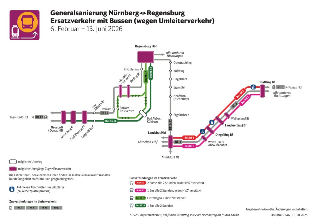 Die Deutsche Bahn führt von 6. Februar bis 10. Juli 2026 eine umfassende Generalsanierung der Bahnstrecke zwischen Nürnberg und Regensburg durch. Im Rahmen dieser umfangreichen Baumaßnahme werden Gleise, Weichen, Oberleitungen sowie zahlreiche Bahnhöfe erneuert und modernisiert.